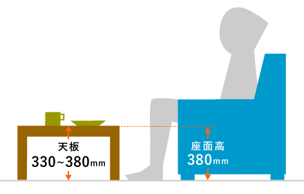 ソファとテーブルまでの距離や、天板の高さとのバランスで、食事のしやすさが変わります。「ソファの座面高からテーブルの天板高さまでの差が約200~250mm」あれば、膝をテーブル下に入れやすく、食事に向いています。