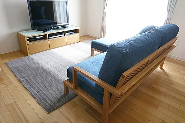 光沢のある生地は、見る位置や時刻により色合いが変化するので、リビングが華やかになりました。