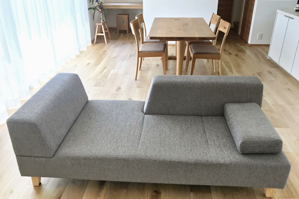 このソファの最大の特徴である、正面と背面のどちらからでも座れるところ。