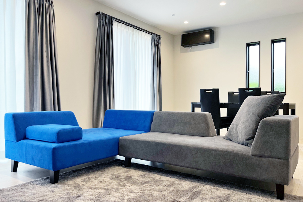 他にこだわった点は、キズや汚れに強くて肌触りが気持ち良い生地を選んだこと、モノトーン系の部屋にアクセントとなるように、2台の内1つをブルーにしたことです!
