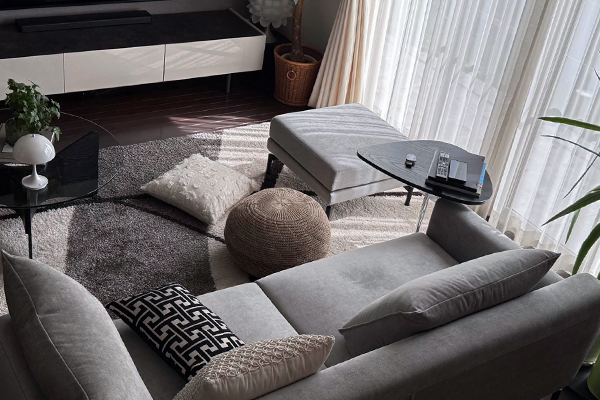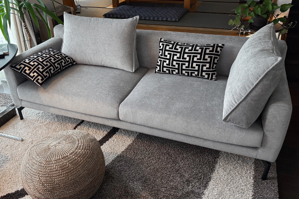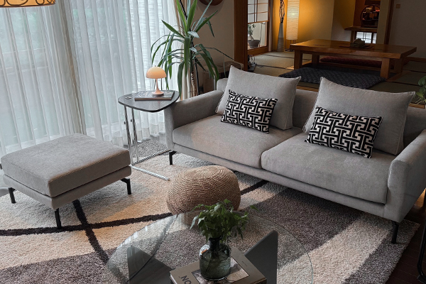 銀座ショールームで展示されているソファLENISを見て気に入り、展示されていた生地と同じGROUP-5、KEシリーズとブラックの脚を選び、スツールも注文。