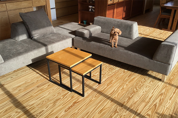 一番悩んだのはカラーですが、飽きがこなくて、木のお家に馴染む薄めのブラウンで、ペットの引っかきに強いタイプにしました。