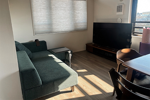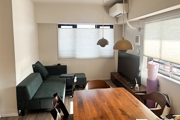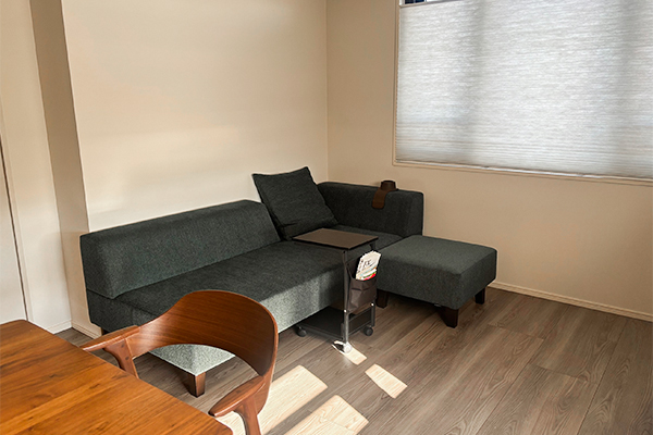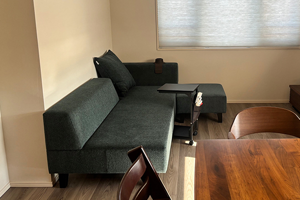 グレー基調の部屋で、ソファはもともとグレーをセレクトしようと思っていたのですが、スタッフさんの勧めでグリーンの生地にて購入しました。